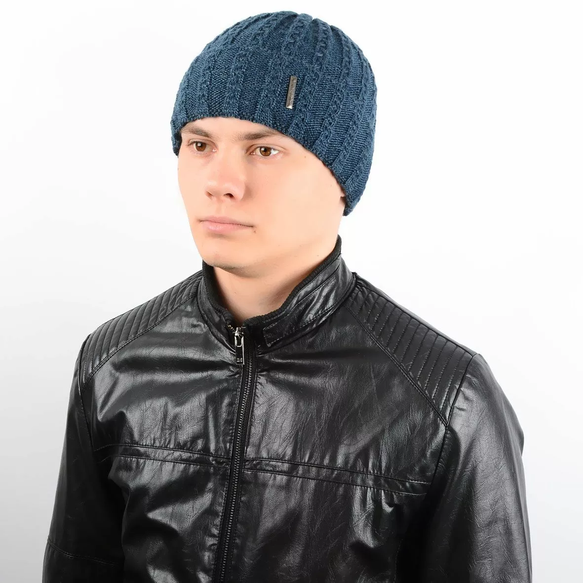 Стильная мужская вязаная шапка, выполнена оригинальной вязкой в
