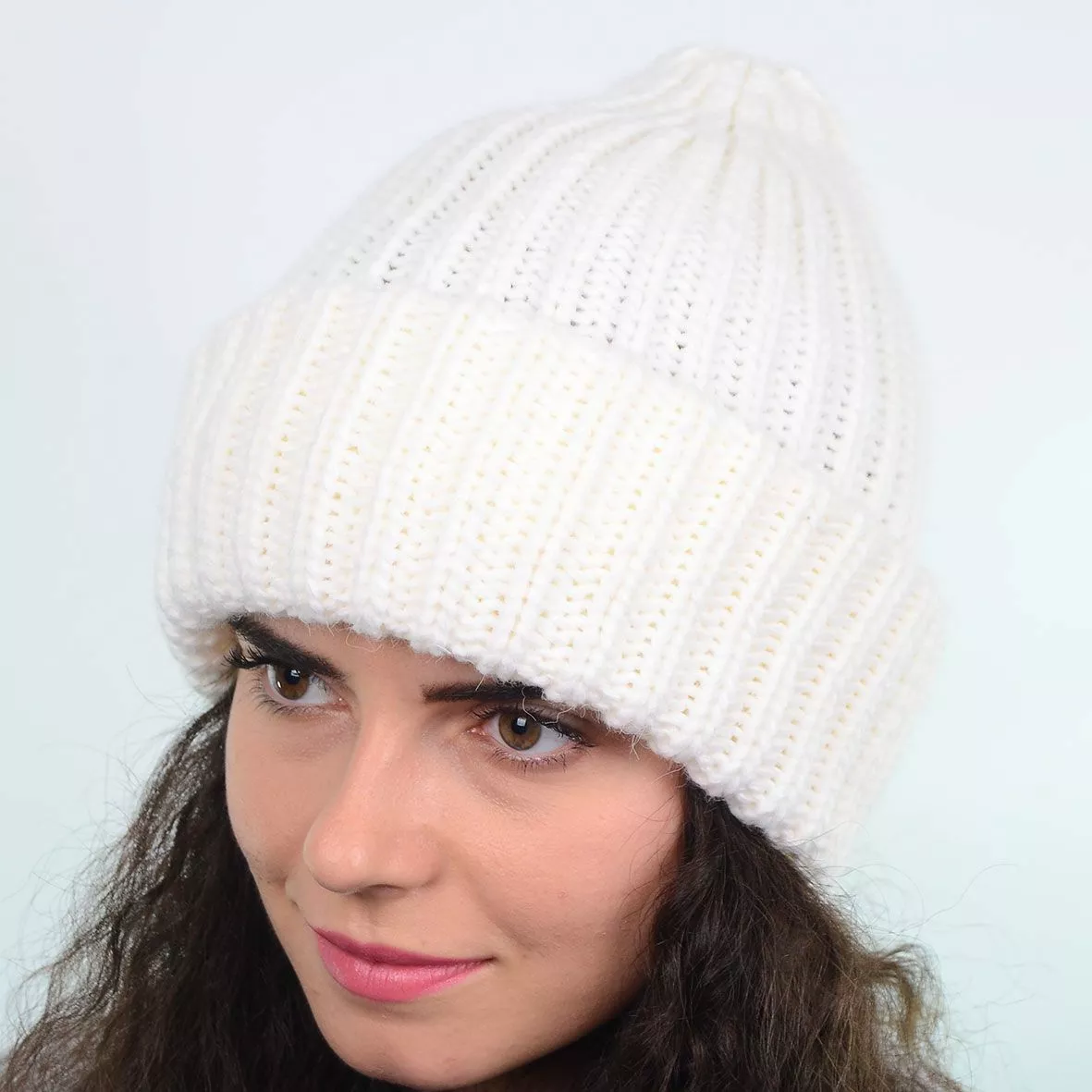 Зимняя женская шапка выполнена крупкой вязкой, имеет двойной