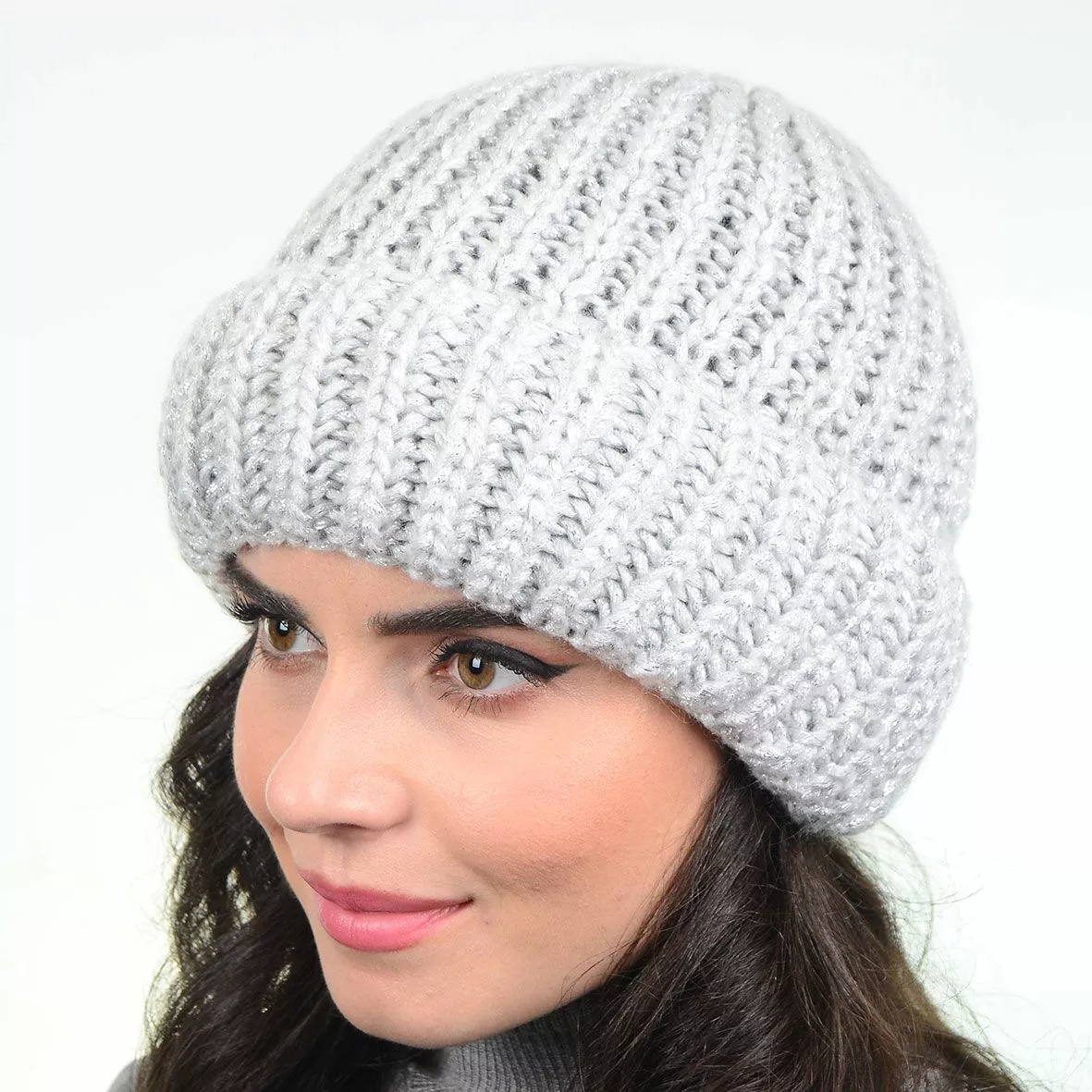 Зимняя женская шапка связана из пряжи с нитями люрекса,